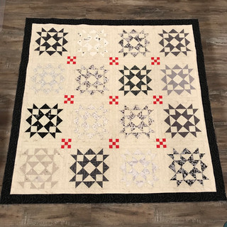 I love how the black border shows off the stitching pattern and how the tiny red nine patch blocks add a pop of color.